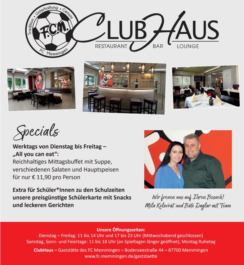 Wir begrüßen Sie herzlich in unserem ClubHaus - der vereinseigenen Gaststätte des FC Memmingen. Wir sind gerne Ihre Gastgeber!